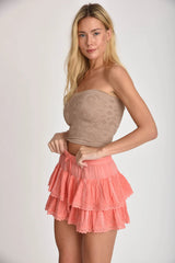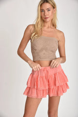 The Coquette Skort has all the perks of a cute mini skirt with the comfort of coverage. Featuring an ultra soft cotton fabric with two tiered ruffles embellished with a delicate tone on tone embroidery.