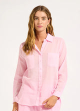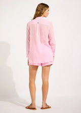A Seafolly Breeze Beach Shirt in a pastel shade of blossom pink is an essential for your beach wardrobe. This lightweight cover up shirt features adjustable long sleeves with pockets.