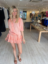 This skirt with built in shorts is the perfect combination of fun and practical! This washed coral skort is semi sheer at the top panel below the adjustable waistband and has a front tie.