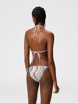 This triangle bikini features a refined wave pattern in lamé fabric, which catches the light with a brilliant and sophisticated effect. The sinuous lines and the play of reflections create an elegant and refined aesthetic, enhancing the silhouette with a touch of glamour, perfect for those who want an exclusive look even by the sea. The classic cut ensures a snug and comfortable fit.