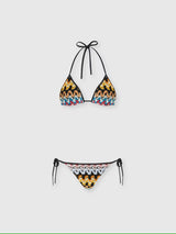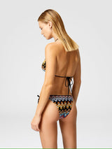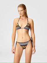 Crafted from lamé viscose lace, this triangle bikini enhances the beauty and quality of the material with refined, luminous details. The delicate lace wraps the figure elegantly, while the zigzag pattern adds a touch of modern vibrancy. The triangle design enhances the natural shapes, offering a comfortable and feminine embrace. A matching tie side brief completes this two-piece swimsuit, adding a touch of timeless elegance.