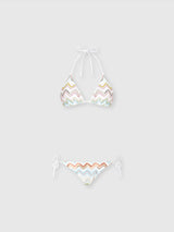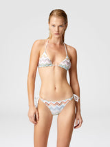 Bikini with triangle bra with the iconic zigzag pattern of the Missoni maison in a 3D variant illuminated by the metallic reflections conferred by lamé and embellished with raschel workmanship. The briefs with side ties offer a personalized fit while the triangle design enhances the décolleté, maintaining the balance between aesthetics and comfort, for an iconic and functional style.