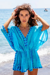 The glamorous Lindsey Brown Mojito silk kaftan comes in a vibrant blue tie dye print. This designer short kaftan shape has a loose elasticated waist and a deep V back and neck, with luxe sequins decorating the neckline, that glisten in the sunshine. The neckline ties on the shoulders, with tie dye silk ties to allow you to pull in the shoulders and back.