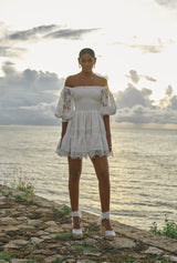 Made from a linen-lace blend, the Ancora dress by Waimari has a shirred bodice that falls into a linen mini skirt adorned with lace panels and trim. Its lace exaggerated sleeves can be worn on top or off shoulders.