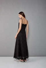 Tube dress with spaghetti straps designed to fit snugly to the body. Adorned with lace trims at the neckline and hem, the dress fastens with a back-centered concealed zipper.