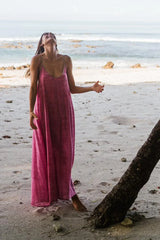 A one size wonder maxi dress with adjustable sparkle straps that has a gently scooped neck and clever ruched detailing at the back that works on all sizes. A subtle nip in at the rib cage gives a flattering flowing form featuring a Balinese Feather print in Wild Orchid.