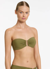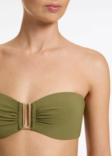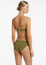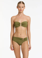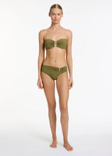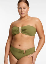 The Jetset elegant bandeau bikini top features moulded cups, gold U bar detail in the center, side boning for shape and definition and clasp back. This supportive and comfortable bikini has matching mid rise bottoms with an asymmetrical U trim detail, regular leg line and coverage.