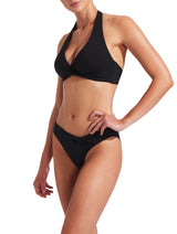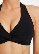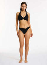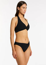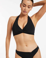 The Jetset classic D/DD cup twist halter bikini top features removable padded cups, seamless look wide band halter straps, a twist neckline detail, side boning for shape and definition and tie back. This supportive and comfortable bikini has matching mid rise bottoms with an asymmetrical twist front drape detail, regular leg line and coverage.