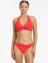 The Jetset classic D/DD cup twist halter bikini top features removable padded cups, seamless look wide band halter straps, a twist neckline detail, side boning for shape and definition and tie back. This supportive and comfortable bikini has matching mid rise bottoms with an asymmetrical twist front drape detail, regular leg line and coverage.