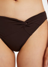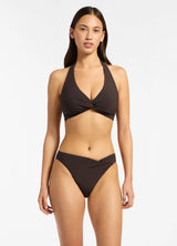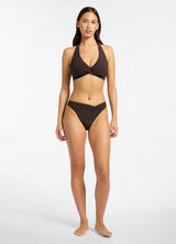 The Jetset classic D/DD cup twist halter bikini top features removable padded cups, seamless look wide band halter straps, a twist neckline detail, side boning for shape and definition and tie back. This supportive and comfortable bikini has matching mid rise bottoms with an asymmetrical twist front drape detail, regular leg line and coverage.