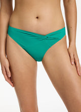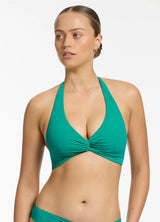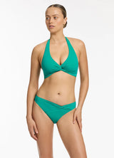 The Jetset classic D/DD cup twist halter bikini top features removable padded cups, seamless look wide band halter straps, a twist neckline detail, side boning for shape and definition and tie back. This supportive and comfortable bikini has matching mid rise bottoms with an asymmetrical twist front drape detail, regular leg line and coverage.