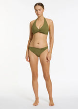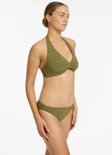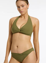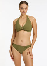 The Jetset classic D/DD cup twist halter bikini top features removable padded cups, seamless look wide band halter straps, a twist neckline detail, side boning for shape and definition and tie back. This supportive and comfortable bikini has matching mid rise bottoms with an asymmetrical twist front drape detail, regular leg line and coverage.