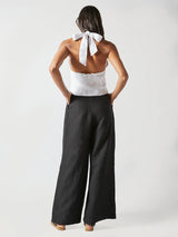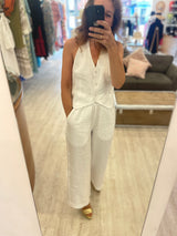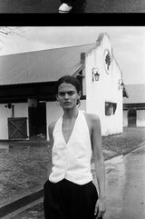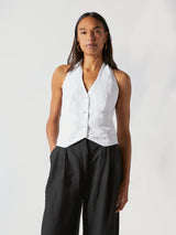 The Abi waistcoat is a tailored and stylish piece with a halter neck design and a free back with an elasticated band. It offers a flattering and comfortable fit that will elevate any outfit.