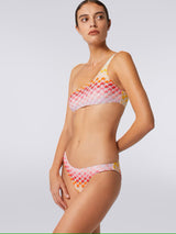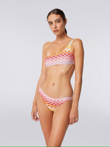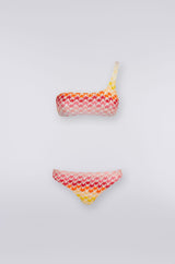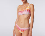 This beautiful two piece is iconic Missoni. The crochet knit fabric is entwined with luxe metallic fibers that shimmer away for added glam. The one shoulder bikini is emblematic of the brand's aesthetic and features bikini briefs with moderate coverage and comes in beautiful shades of yellow and reds.