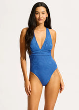 A beautiful one piece with a textured fabric. This Seafolly swimsuit features a plunge neckline, cross back, flattering front paneling and a regular leg line for moderate coverage.