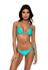 Luli Fama Luli Chic Triangle Top and Wavy Back Tie Side Skimpy Bottoms with trim outlined with stitched gold detail.