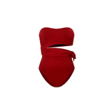 Like a bustier top, this bandeau swimsuit is reinforced and has an elastic and a silicone band that perfectly supports the chest. This elegant and chic cut out one piece is to be tied on the left side to gently mark the waist and bring volume to the swimsuit. Fully lined with removable padding. This suit is most suitable for a smaller bust A-C.