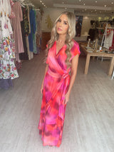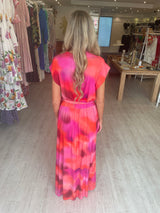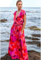 The Sienna dress in wild cotton is an invitation to the holidays, a long kimono-style wrap dress to wear according to your desires. Decorated with a braided cotton cord. Simple and elegant, it’s the perfect Summer dress. This is a medium weight jersey super soft feel fabric in a vibrant pink hue print.