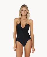 Dive into sleek with the Midnight Black Josie Halter One Piece Swimsuit – your new secret for all-day confidence with a dash of chic with every swim. Featuring ruched detailing that loves every curve, this one piece swimsuit is a timeless classic, redefined. It ties neatly behind the neck, offering that extra lift and versatile coverage when conquering waves or lounging in style. Plus, with its halter neckline, removable padding, and built-in shelf bra, you'll feel all the comfort while never compromising on support.