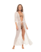 Make a statement this Summer in our Lattice Duster swimsuit Cover-up! This floor-length style is the epitome of beachside chic. It features a 3/4 puff sleeve and adjustable tie-front details. The super soft stretchy lattice fabric features an open front and waist tie so you can adjust its coverage.