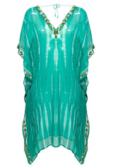 Swish and sway through any luxury resort in this pretty silk knee length kaftan. The glamorous Daiquiri silk kaftan comes in a gorgeous aqua green and gold tie dye print, decorated with pretty gold sequins on the neckline, side seams and scattered on the front to subtly shimmer in the sunlight.