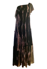 The Mykonos bardot maxi dress is perfect for winter sun holidays, warm summer weddings and evenings in luxury resorts. The black silk print is teamed with a bronze and mauve tie dye that is so flattering on all skin tones. Lined to the second tier, the skirt is floaty and full enough to wear with or without the belt.