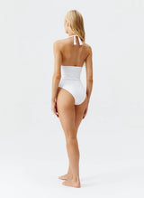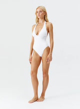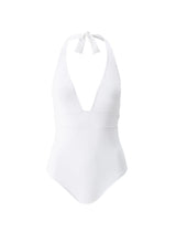 Opt for timeless glamour as you head for the beach in the Andros Swimsuit. Effortlessly elegant, this crisp White one-piece is crafted from premium, breathable swim fabric with SPF 50+ protection. This streamlined design features a halterneck tie with a plunging ‘V’ neckline and a figure-flattering panel beneath the bust to enhance the waist.