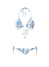 Elevate your swimwear collection with the classic Key West Bikini. The triangle top features removable pads, tying at the nape of the neck and back. Emblazoned in a delicate botanical motif, this blue and white set has small gold rings connect the cups and straps. Completing the set are tie side bikini bottoms with gold-tone branded cord-ends that allow you to create your desired level of coverage.