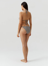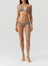Make a statement in the Menorca Bikini set in striking Chain print. This timeless triangle top features removable pads for a customisable fit and a distinctive horsebit trim at the centre bust, adding a touch of luxe refinement. Paired with the matching tie side bottoms, which mirror the signature horsebit accents at the hips, finished with luxe gold cord ends for a polished, sophisticated look.