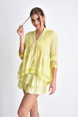 Turn heads in this effortlessly feminine top featuring a button-front silhouette with floral lace detailing throughout, 3/4 sleeves with lace cuffs, and a loose, flowy body. The Jolene is the perfect summer top. Pair with the Coquette skort for the complete look!