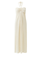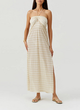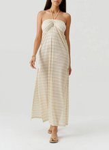 Exude effortless holiday glamour with the Mila Dress in radiant Gold. Designed in a lightweight, metallic knit, this shimmering maxi dress captures the essence of elegant resort dressing. Cut in a timeless bandeau silhouette, it features delicate ruching at the bust and sultry side splits that move beautifully as you walk. Slim halterneck straps tie at the nape, adorned with signature gold-tone hardware for a touch of elevated sophistication.