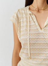 Radiate effortless glamour in the Remi Dress in shimmering Gold. Crafted for a relaxed, loose fit, this mid-thigh length silhouette features a tiered skirt and gently shirred waist for a flattering, feminine shape. Flowing cap sleeves and a soft ‘V’ neckline add to its romantic charm, while a delicate tie detail creates a subtle keyhole accent at the bust. Finished with metallic accents and luxe gold cord ends.