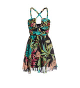 This hybrid mini dress features a built-in bodysuit made from stretchy Lycra fabric that sucks you in. The bodice features a cross-front neckline with adjustable panels and the A-line skirt is made from semi-sheer chiffon fabric and features a detachable slip lining that easily snaps in and out. Bottom snap closure.