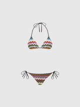 Bikini with triangle bra with the iconic zigzag pattern of the Missoni maison in a 3D variant illuminated by the metallic reflections conferred by lamé and embellished with raschel workmanship. The briefs with side ties offer a personalized fit while the triangle design enhances the décolleté, maintaining the balance between aesthetics and comfort, for an iconic and functional style.