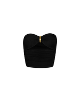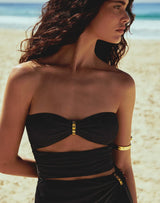 The ViX Fae Top is a strapless style with a soft sweetheart neckline, subtle ruching throughout, and a refined cutout beneath the bust. A gold-plated front detail adds a sophisticated finishing touch.