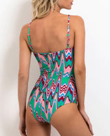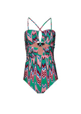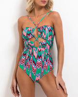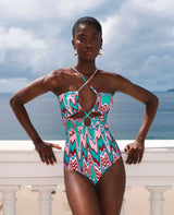 This Patbo one-piece swimsuit features cross-front straps and small cut-outs. This stunning swimsuit is in a striking wave print flattering any silhouette. Model wears size Small.