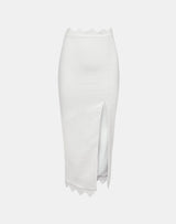 Reveal your inner trendsetter by making a statement in the Imani Midi Skirt. This silhouette was made with your curves in mind, in the Vix exclusive Firenze textured crepe fabric. This skirt will set you apart with fitted form, high-slit hem, and laser-cut geometric trim.